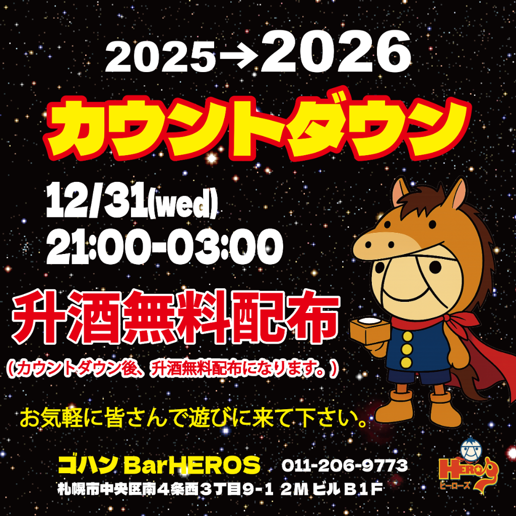 お知らせ2025.12.12カウントダウン開催決定! 今年もカウントダウンやります!時間21:00~03:00升酒の無料配布もあります。皆様お誘いあわせの上是非遊びに来て下さい。 お問合せはお電話でお願い致します。011-206-9773