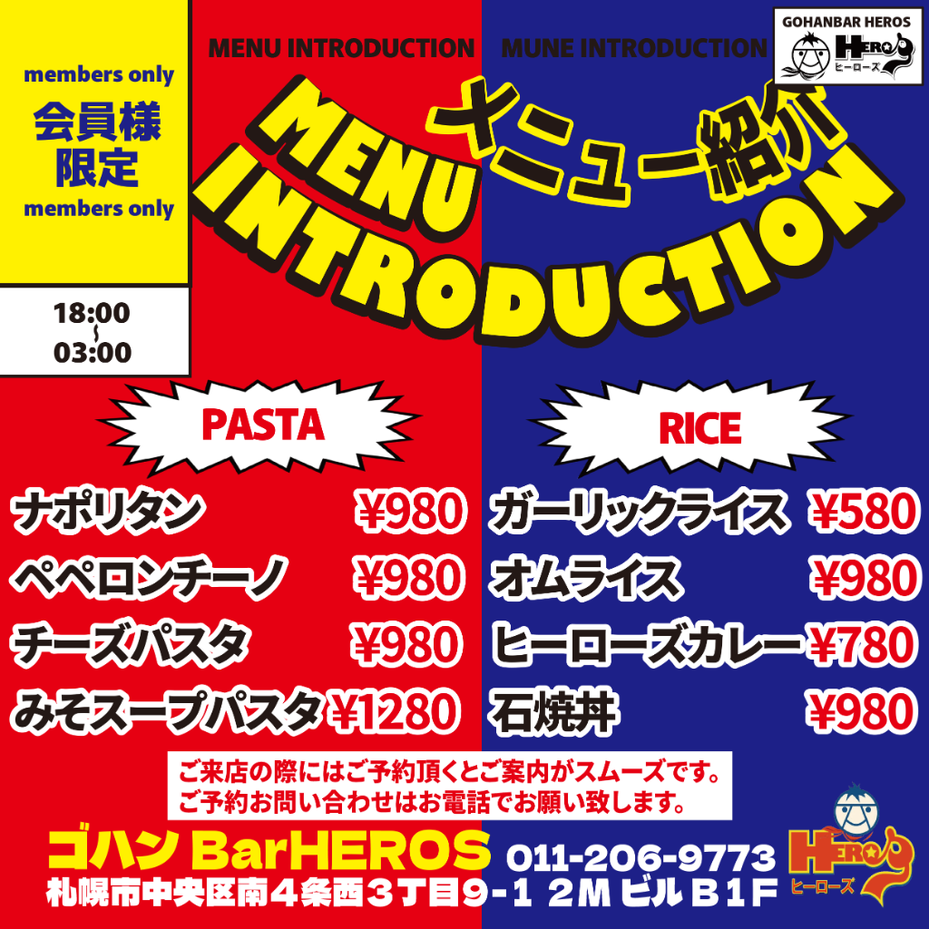 お知らせ2025.09.25フードメニュー紹介 フードメニューがリニューアルしました。お食事にもおつまみにもぴったりのラインナップです。ぜひ食べに来て下さい。ご来店の際にはご予約頂くとご案内がスムーズです。ご予約お問い合わせはお電話でお願い致します。011-206-9773